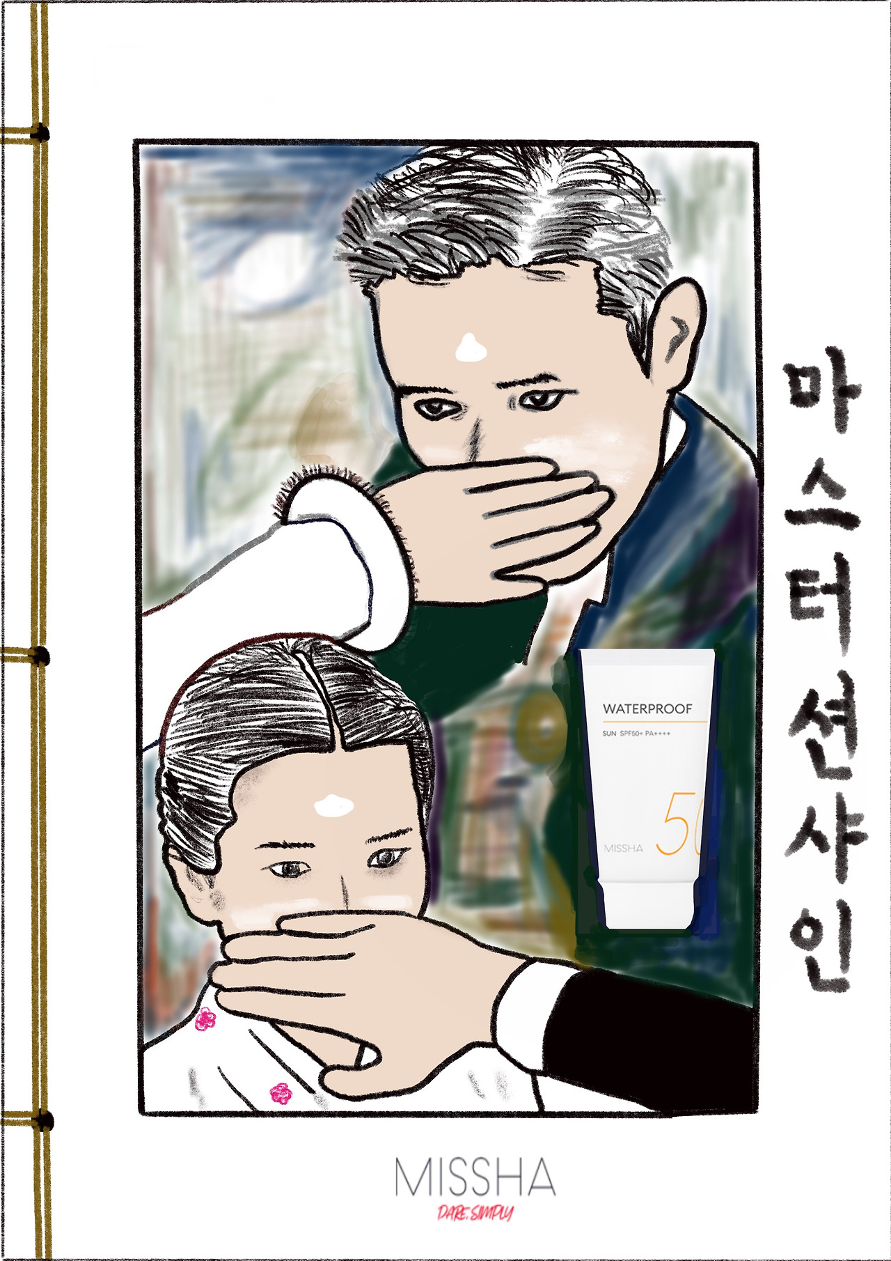 미스터를 마스터로 살짝 바꿨더니 자외선 차단제와 잘 붙는 카피인 듯 하여 미스터 션사인 포스터 비주얼을 패러디해 그려봤습니다. 손바닥으로 서로의 얼굴에 차단제를 발라주는 중이랍니다. 잘 보이시나요? ㅋ