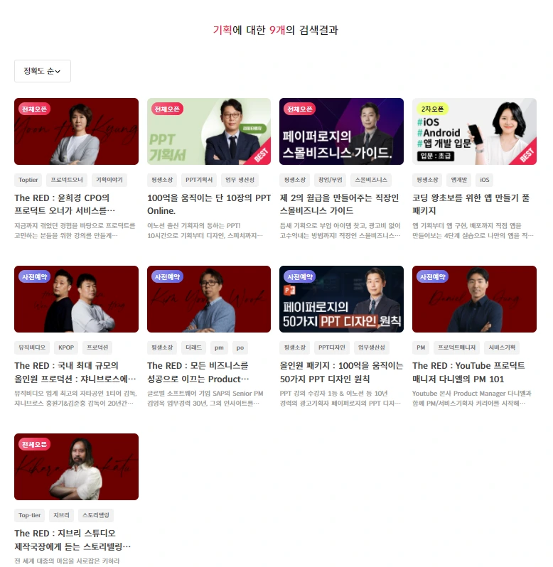 인터넷 강의계에선 이미 메이저급으로 성장해 있는 온라인 강의 플랫폼이다. 강의 대기업답게 많은 종류의 강의, 특히 기획 강의도 서비스기획자, Product Manager, Product Owner 등 직무별로 나누어져 있고, 기획자가 가장 많이 다루는 툴인 PPT 작성에 관한 강의도 있다.