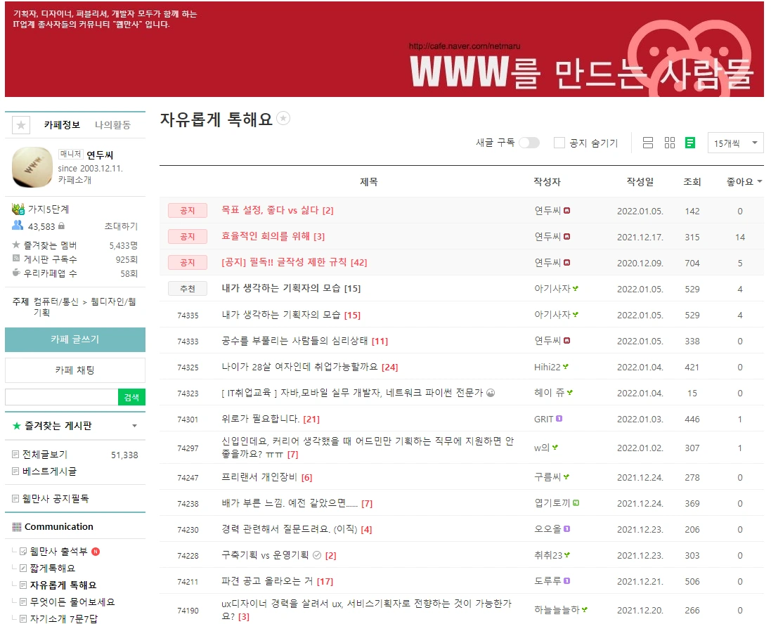이곳은 약 4만 명의 신입, 경력의 IT기획자가 모여있고, 이들은 기획자의 모든 정보를 공유한다. 지금도 글쓴이는 자주 방문해서 필요한 정보를 습득하곤 한다. 대표적으로 자주 올라오는 글의 종류는