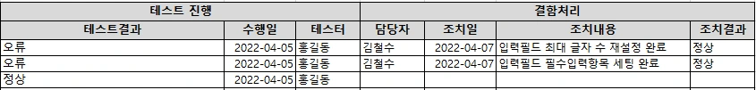 조치결과 - 조치 후 해당 항목의 상태를 작성(ex: 협의 필요, 정상, 추가 오류 발생 등)