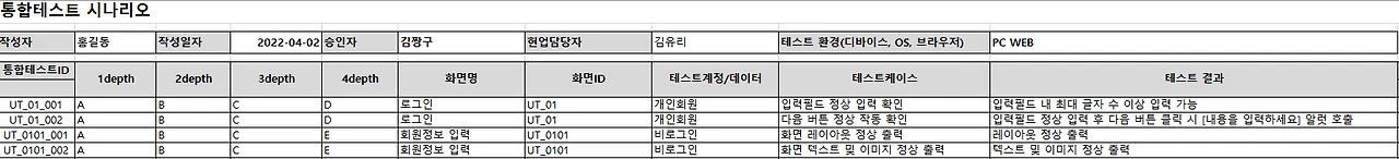 테스트ID - 화면 ID에 테스트케이스의 분류를 네이밍 하여 작성(ex: 화면 ID + Function=001, UI/UX=002, Text=003 등)