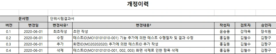 앞서 작성한 다른 문서들과 마찬가지로 단위/통합테스트 문서 또한 개정이력을 작성해야 하는데, 테스트 문서의 개정이력 목적은 다음과 같다.