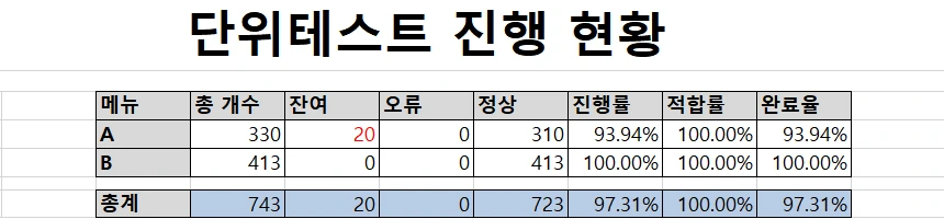 ㄴ완료율: 총 개수 대비 테스트 실시한 항목(정상+오류)의 개수