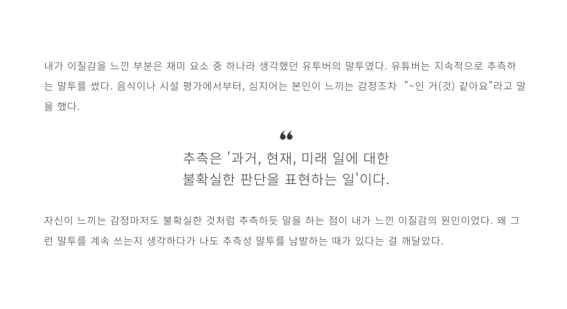 앞에서 말한 1~3번을 잘 활용한다면, 추측성 말투를 사용하더라도 신뢰가 생길 수 있겠죠. 하지만 저는 어떤 의견을 낼 때 추측성 말투는 최대한 안 하는 편입니다. 다만, 의견을 낼 때 내 의견에 뒷받침이 되어 줄 근거를 많이 찾아봅니다. 불현듯 툭 던진 의견이 좋은 결과물을 가져오기도 하지만 이런 경우는 드물뿐더러, 제 의견에 제가 자신이 없는 건 책임감이 부족하다고 보거든요. 안 그래도 어떤 문제가 진짜인지 찾아야 하는데, 추측이 난무한 문제들 사이에서 헤매지 않기 위해선 의견 내기 전 조금의 근거라도 내세우는 게 좋습니다.