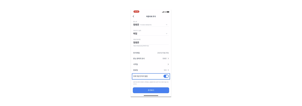 주요 기능은 아니지만 간혹 자신이 등록한 이체 주기나 기간에 변동이 있어 수정이 필요한데 까먹은 경우 이체 1일 전 알림이 온다면, 원하지 않는 이체가 발생하는 불상사를 막을 수 있겠죠. 요즘처럼 일상에 필요한 자동이체가 많고, 이리저리 바쁜 K-직장인이라면 더욱 필요한 기능입니다.
