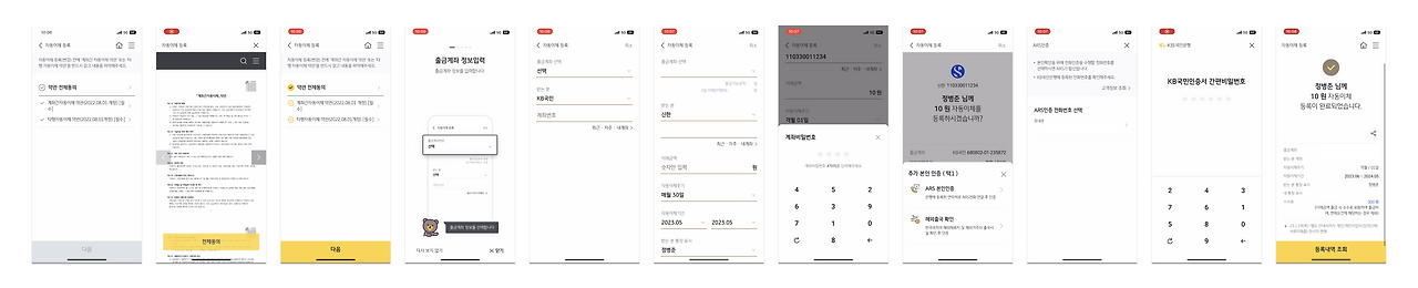 "자동이체 등록 - 약관동의 - 가이드 화면(5개) - 정보 입력 - 계좌비밀번호 입력 - ARS 본인인증 - 간편 비밀번호 입력 - 완료"까지 대략 2분 정도 소요됐습니다. 지극히 개인적으로 4개의 은행 중 가장 불편했어요. 필요한 기능은 모두 있었으나, 다른 앱들과 비교했을 때 불필요한 경험들이 가장 많았기 때문인데요(빨간색으로 된 단계들). 아쉬웠던 점만 남은 KB스타뱅킹, 더 자세히 살펴보겠습니다.
