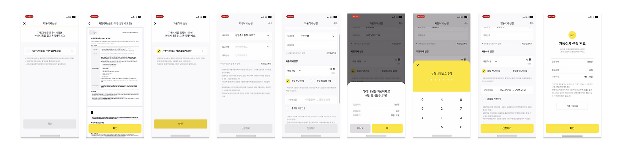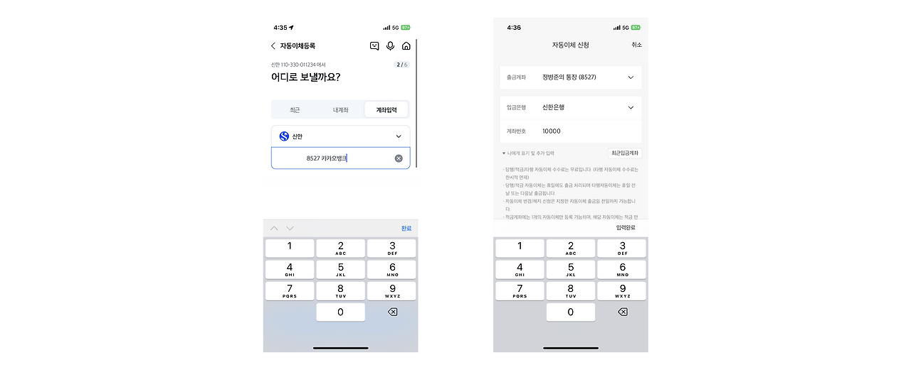 "자동이체 등록 - 출금계좌 선택 - 입금계좌 선택 - 금액 입력 - 이체 기간, 주기 선택 - 계좌비밀번호 입력 - 약관동의 - 입력정보 확인 - 완료"까지 대략 2분 정도 소요됐습니다. 신한 쏠 또한 불편한 게 있었지만, KB스타뱅킹 대비 많지는 않았습니다. 다만, 각 입력 항목들이 별도 화면으로 분리되어 있던 점, 이체주기 설정이 불가능한 점, 계좌번호 복사 시 문자도 복사된다는 점은 짚고 넘어가야겠어요.