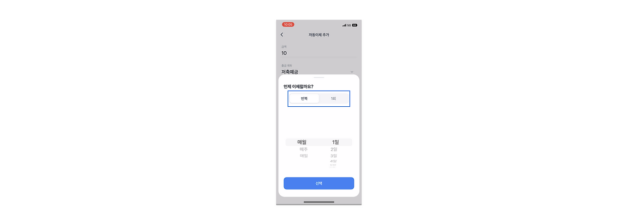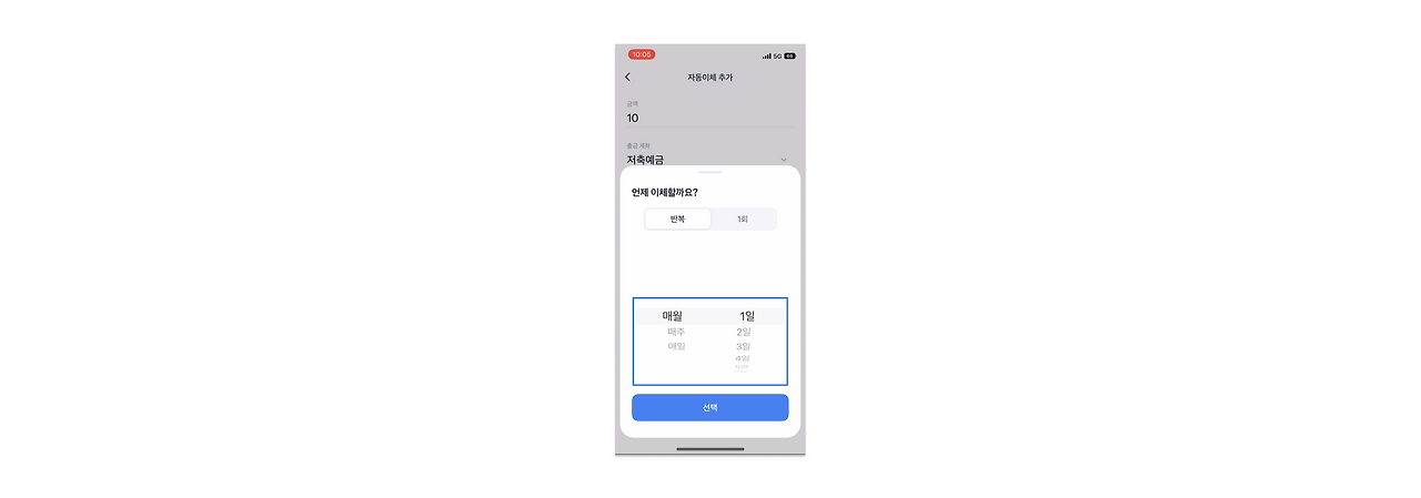 토스뱅크는 이체주기 설정 시 가장 먼저 보이는 상단에 [반복]과 [1회] 버튼을 두었습니다. 바로 위 사전적 의미에 걸맞은 자동이체의 본질에 충실한 기능을 제공하고 있는 것인데요, 덕분에 고객은 단 한 번의 이체라도 지정한 날짜에 이체할 수 있는 서비스를 이용할 수 있습니다. 물론, 타 은행앱에서도 시작일과 종료일을 설정하여 1회 이체를 할 수 있지만 [1회] 버튼을 누르는 것과 앞서 말한 과정을 경험하는 건 사용성의 차이가 있겠죠.
