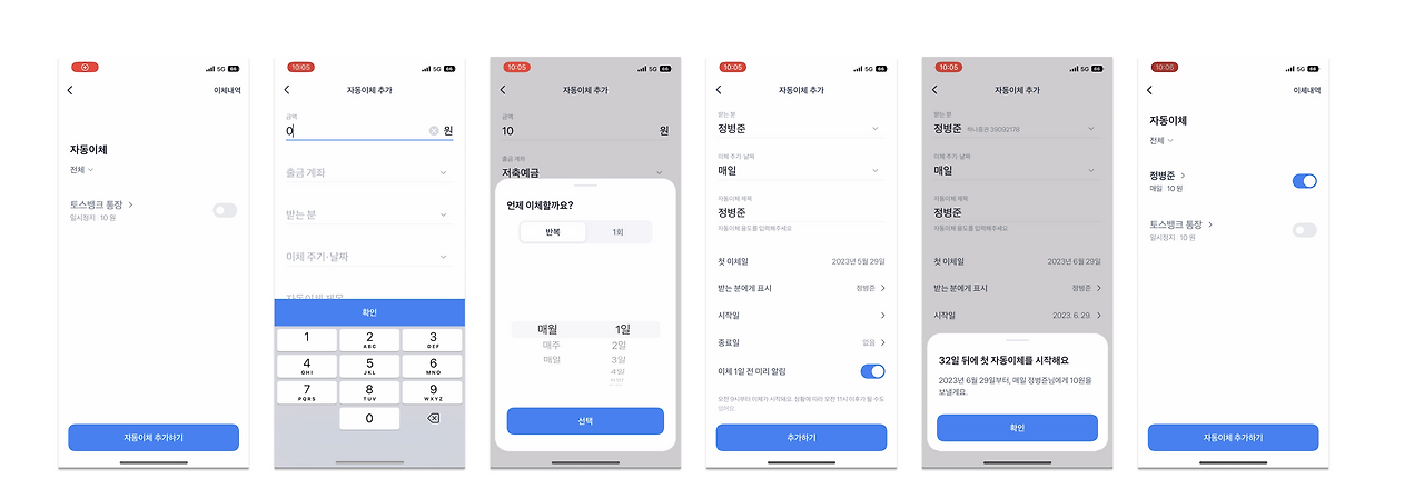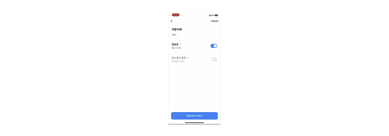 자동이체 서비스를 경험하며 마주한 기능들 중 가장 감탄했던 부분입니다. 해지하기 위해 몇 개의 화면과 버튼을 거쳐야만 했던 다른 앱들과 달리 버튼 하나로 On/Off의 제어가 가능해요. 이름이 자동이체인 만큼, 쓰임이 반복적인 만큼 고객의 자동이체 서비스 경험을 루틴화하기 위한 설계가 아닐까요? 우리가 시간을 설정한 뒤 필요할 때마다 켜고 끄는 알람처럼 말이죠.