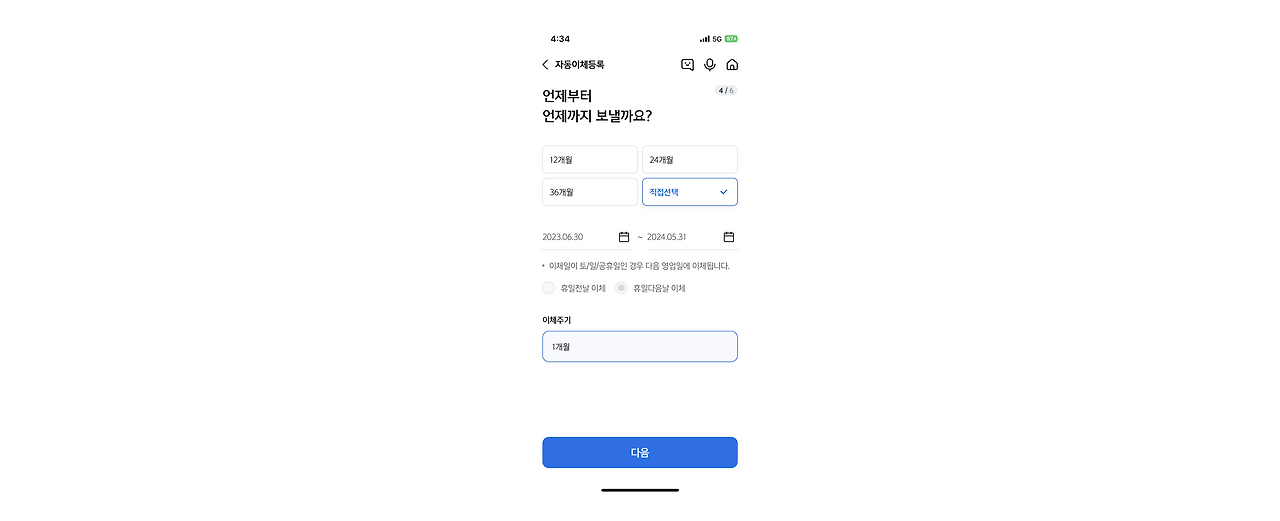 우선 입금계좌가 타행인 경우 이체 주기 설정이 '매월', '격월', '분기'로 일 단위가 아닌 월 단위로만 가능한 점이 불편했어요. 물론 KB 간 거래는 1달 단위로 주기 선택이 가능했지만, 일 단위로 쪼개지지는 않았습니다. 최소 설정 가능한 이체 기간 또한 타행은 3개월 이상으로 1달도 가능한 KB 간 거래에 비해 제약이 컸습니다.