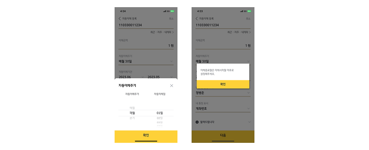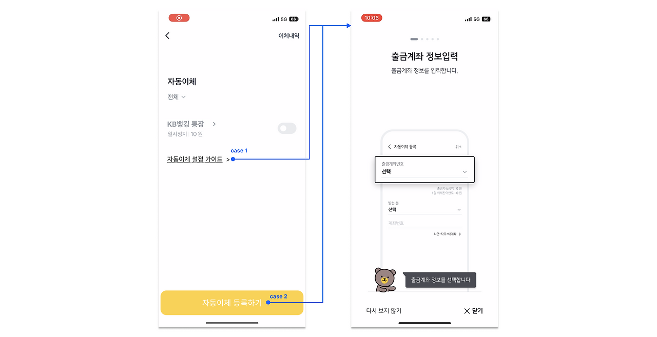보통 서비스 가이드는 고객이 서비스 경험을 시작하기 전 볼 수 있도록 메인이 되는 곳에서 노출시키거나, 버튼을 두어 필요한 사람만 열어서 볼 수 있도록 합니다. 아쉽게도 KB스타뱅킹에서는 자동이체 등록을 시작한 후 약관동의를 거치면 갑자기 보입니다. 물론, [닫기] 버튼을 통해 빠르게 다음 단계로 진입할 수 있지만 '가이드'라는 성격에 맞는 노출 위치는 아니기 때문에 아쉬운 부분이었습니다.(자동이체를 등록하면서 어렵다고 느낀 부분이 딱히 없기도 했어요)