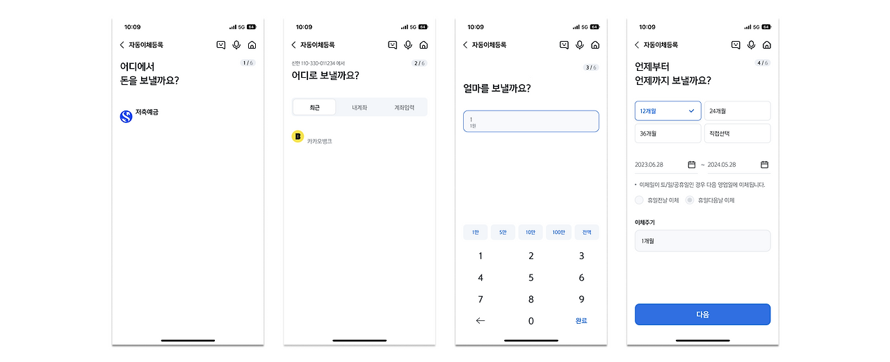 모바일에서 자동이체 서비스가 도입되고 나서부터 반복적으로 해야 했던 많은 업무들을 터치 몇 번에 원하는 기간 동안 해결할 수 있게 되었어요. 이제는 자동이체를 통해 고객이 해결하고자 하는 문제가 너무 다양해져가고 있습니다. 이에 따라 입출금 계좌도, 이체 금액도, 이체일도, 이체 주기도 모두 제각각으로 요구되며 이 요구를 수용할 수 있는 서비스가 살아남을 거예요. 앞으로도 자동이체가 필요한 업무는 계속 늘어날 텐데, 고객의 주거래은행이 타행에 비해 불편하다면 들었던 정마저 떨어질 위험이 클 거 같습니다.