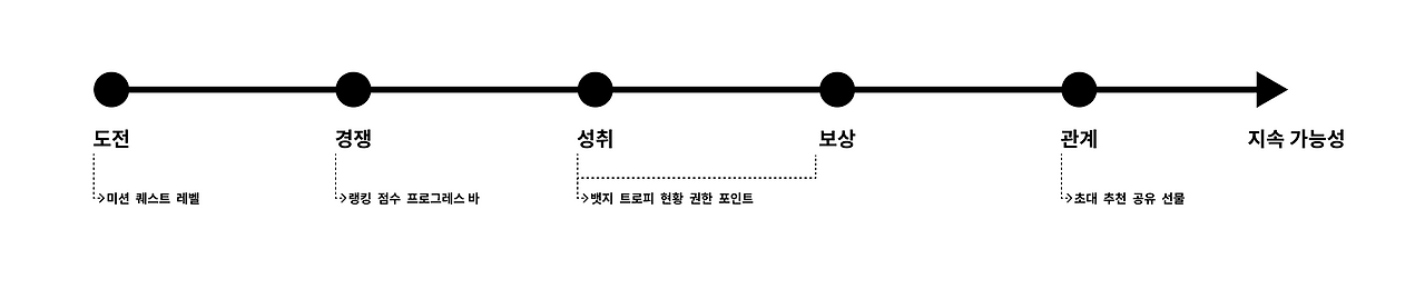 관계 : 경쟁 요소와 마찬가지 이유로 타인에게 서비스 공유가 가능하다면 진행 중 재미 요소를 더 높이고, 목표 달성 후 다른 사용자의 유입을 기대할 수 있을 거예요. AARRR 이론의 Referral 지표와 연관성이 높습니다.