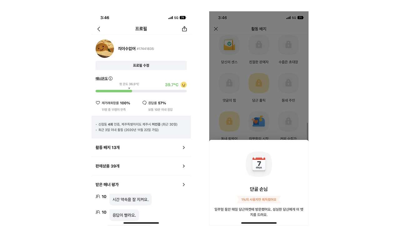 보상 : 매너온도가 높은 사용자는 같은 매물 조건에서도 우위를 점할 수 있는 보상이 주어집니다. 또한, 활동 배지를 모으고 대표 배지로 설정하며 타인에게 보이는 보상을 제공합니다.