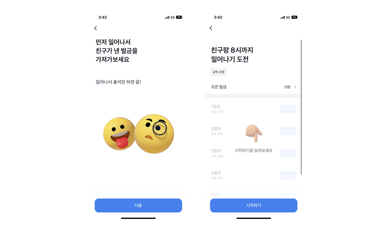 경쟁 : 참여자 간 출석 및 벌금 납부 현황이 공유되고, 모이는 상금을 보여주면서 자연스러운 경쟁을 통한 몰입을 유도합니다.