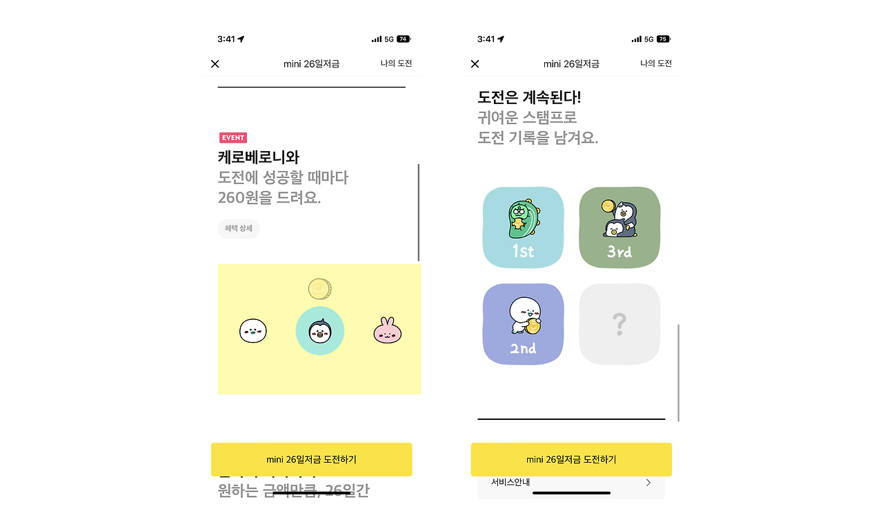 도전 : 26일간 매일 일정 금액을 납입하는 미션을 제공하여 사용자로 하여금 미션 달성에 대한 동기를 부여함과 동시에 저금을 유도합니다.