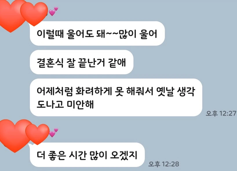 결혼식이 끝난 다음 날 그때야 눈물이 한가득 터져 나오더라고요. 오빠도 그랬다고 합니다. 엄마는 식 당일 축사를 연습하며 아침에 한가득 눈물을 이미 쏟아내셨다고 하더라고요.
