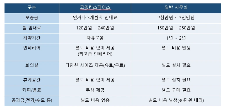 코워킹스페이스와 일반 사무실의 비교 (4인실 기준)