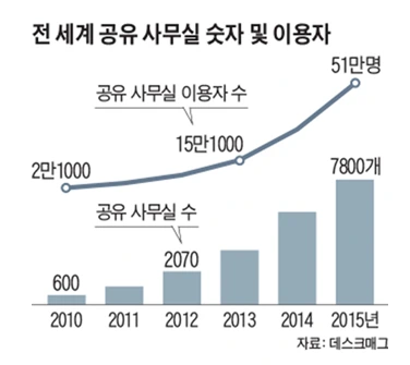 공유 오피스 전문 사이트인 데스크매그에 따르면 2016년 기준 전 세계 코워킹스페이스 업체는 1만 1300개로 전년 대비 30% 늘었습니다. 입주해서 일하는 사람도 2015년 51만 명에서 2016년 83만 5,000명으로 30만 명 이상 늘었다고 합니다. 글로벌 부동산 컨설팅 기업 CBRE가 2016년 초에 발표한 리포트에 따르면 미국 코워킹스페이스 시장은 지난 5년 간 매년 평균 21%씩 성장했습니다. 또한 CBRE가 미국의 부동산 회사 226개사를 대상으로 설문 조사한 결과에서도 응답자의 40% 이상이 공유사무실을 이용 중이거나 이용을 고려하고 있다는 결과가 있습니다.