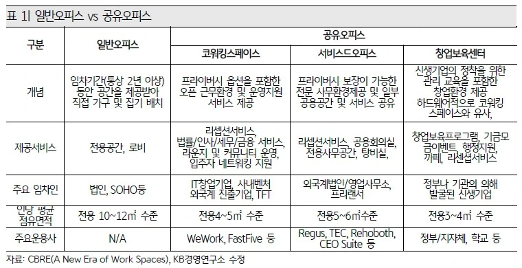 전 세계적으로 창업 열풍이 불면서 소규모의 스타트업들이 많아졌고 이들이 코워킹스페이스의 주요 고객이 되고 있습니다. 또한 과거에는 카페에서 커피 한잔을 시켜놓고 눈치 보면서 하루 종일 시끄러운 곳에서 근무하거나 공부하던 카공족들도 코워킹스페이스를 많이 찾고 있습니다. 사용자(임차인) 입장에서는 다양한 장점이 있지만 무엇보다도 합리적인 비용으로 쾌적한 사무공간에서 다른 것에 신경 쓰지 않고 업무에 집중할 수 있다는 것입니다. 아시는 바와 같이 자체 사무실을 운영하다 보면 공간을 운영하고 유지하기 위해 발생하는 시간과 비용이 만만치 않은데요 이러한 문제들을 모두 알아서 해주기 때문에 매우 편리합니다. 운영 업체마다 다르기는 하지만 대부분 개별 인원에 맞는 사무 공간을 포함하여 다양한 규모의 회의실은 물론, 프린터 팩스와 같은 복합기와 각종 사무기기 등을 공동으로 사용할 수 있는 비즈니스 라운지와 커피나 맥주를 무료로 제공하는 휴게실 등을 비치하여 업무의 효율성을 높이고 사무실을 운영하는데 드는 시간과 비용을 절약해줍니다.