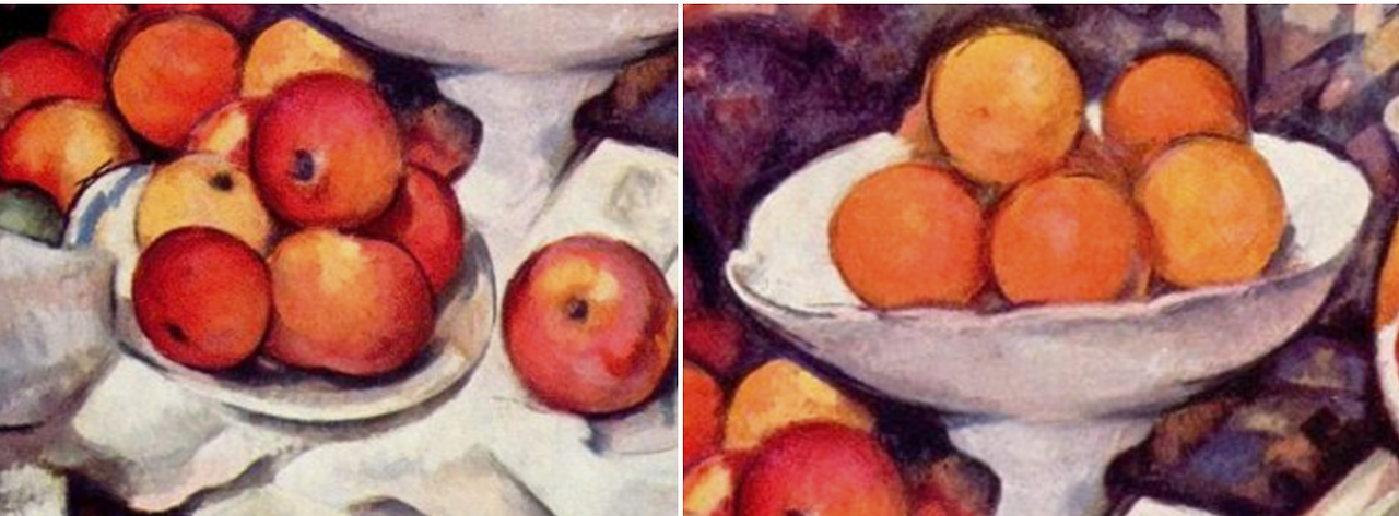그런 생각을 지닌 세잔의 정물화에서의 특이점은 도저히 한 시점에서 그렸다고 볼 수 없는 대상에 있다. 왼쪽의 잘 익은 사과는 위에서 본 듯하고, 오른쪽의 가지런하게 쌓여 있는 오랜지는 아무리 봐도 앞에서 본 것이다. 만약 사과와 오랜지가 움직이지 않았다면 이런 그림을 그리기 위해서는 움직이지 않는 사과와 오랜지를 작가 자신이 '움직이면서' 그려야 한다.
