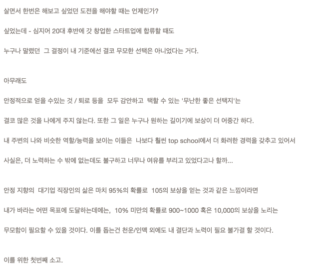 30대 후반 / 10년차 커리어쯤에 뒤늦게 '스타트업 창업/팀 합류'이라는 것을 경험함으로서 더 배운 것 같다.