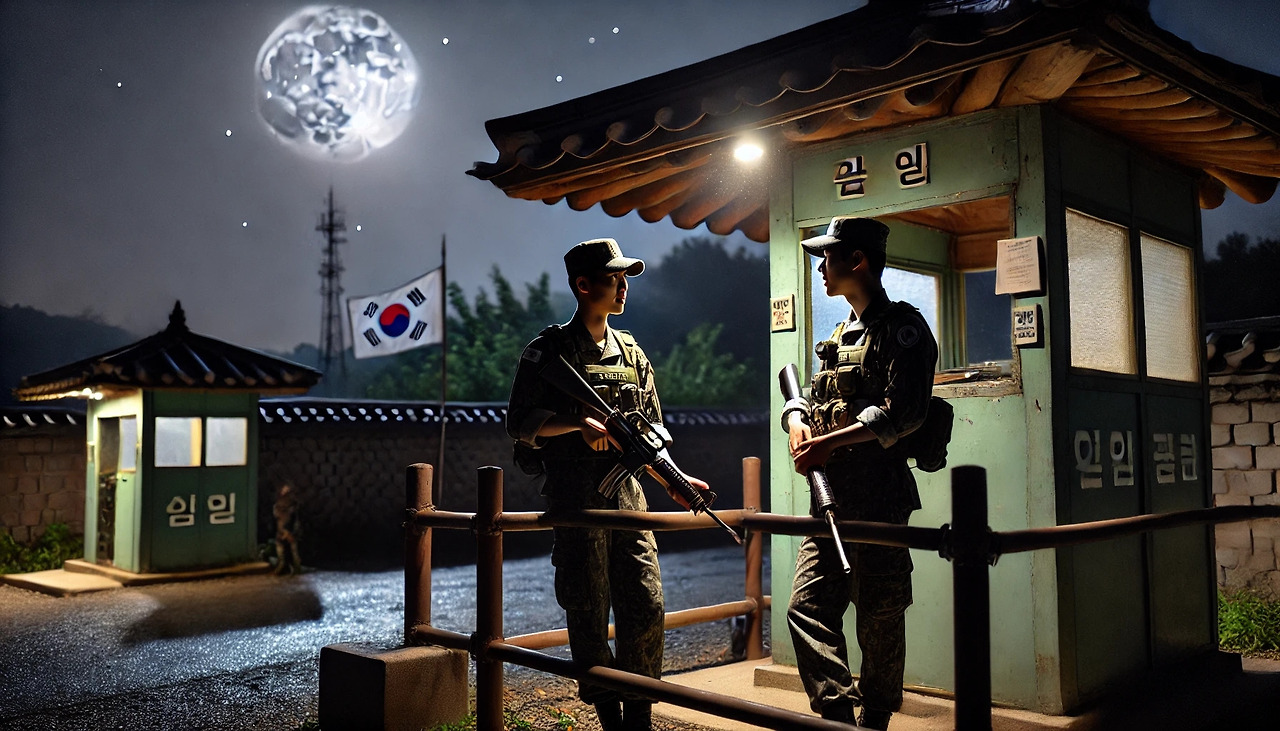 적막한 밤, 위병소에는 풀벌레 소리만 나지막이 들려옵니다.