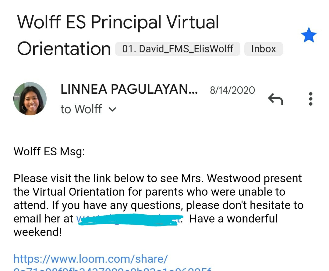 그리고 같은 날 교장 선생님이 오리엔테이션 영상을 모두 녹화한 비디오 링크를 담아 이메일을 보냈다.