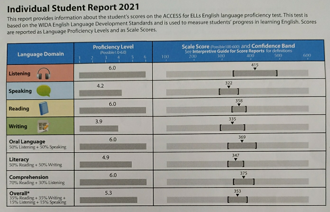 위의 사진은 미국에 거주하고 한 이중언어 아동의 테스트 결과이다. 듣기와 읽기는 최고 6단계, 말하기, 글쓰기는 4단계로, 평균 5.3이 나와서 테스트에 통과했다. 일반적으로 이중언어 아동의 말하기와 글쓰기 표현능력은 초등학교 저학년 때는 다른 단일 언어 아동에 비해 낮을 수 있지만, 3학년이 되면 비슷한 수준이 되므로 걱정하지 않아도 된다.