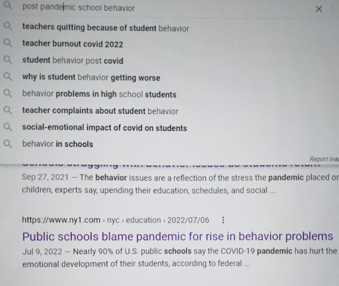 발표한 데이터에 따르면, 미국 공립학교의 80퍼센트 이상이 코비드 19 팬데믹이 학생들의 행동 및 사회-정서 발달에 부정적인 영향을 미쳤다고 보고했다고 한다. 팬데믹의 여파로 학생들의 비행(56%), 교실 밖에서의 난잡함(49%), 교사와 교직원에 대한 무례한 행위(48%), 전자 기기 사용 금지로 인한 교실 내 혼란(42%)으로 수업 중단 사건이 증가했다는 것이다. 이러한 학생들의 문제 행동 외에도 2021~2022학년도 공립학교 학생들의 장기결석이 증가한 것도 문제점으로 지적되었다.