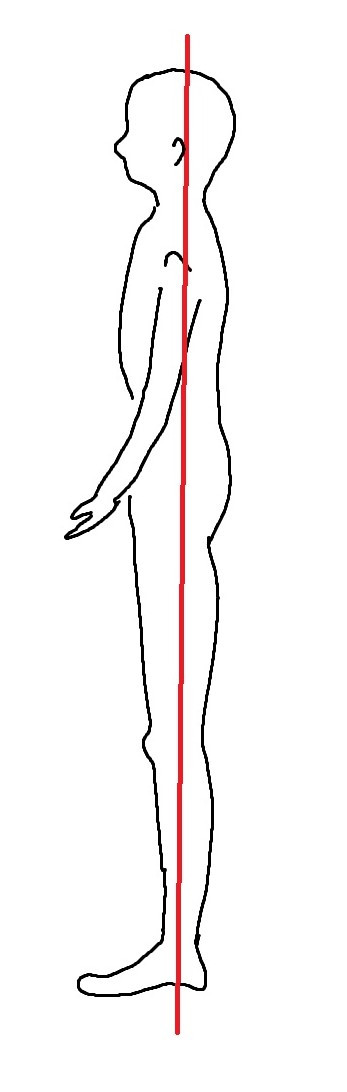 옆에서 봤을 때, 발의 복사뼈 위에 무릎, 그 위에 골반 그리고 어깨의 중앙, 귀