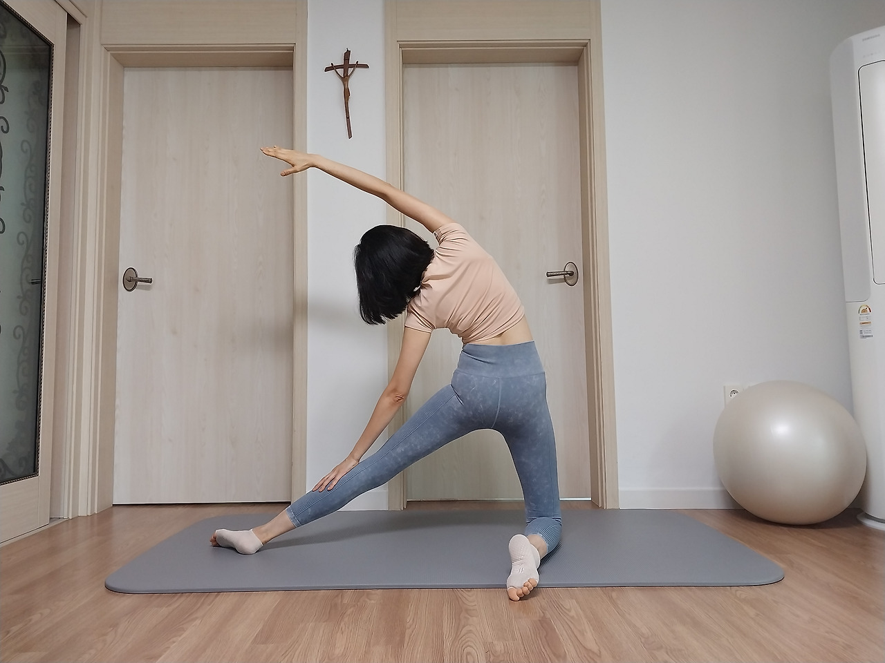 오른 측면에서는 측면 중 골반 바로 위쪽을 더 신경 써서 늘려줍니다.