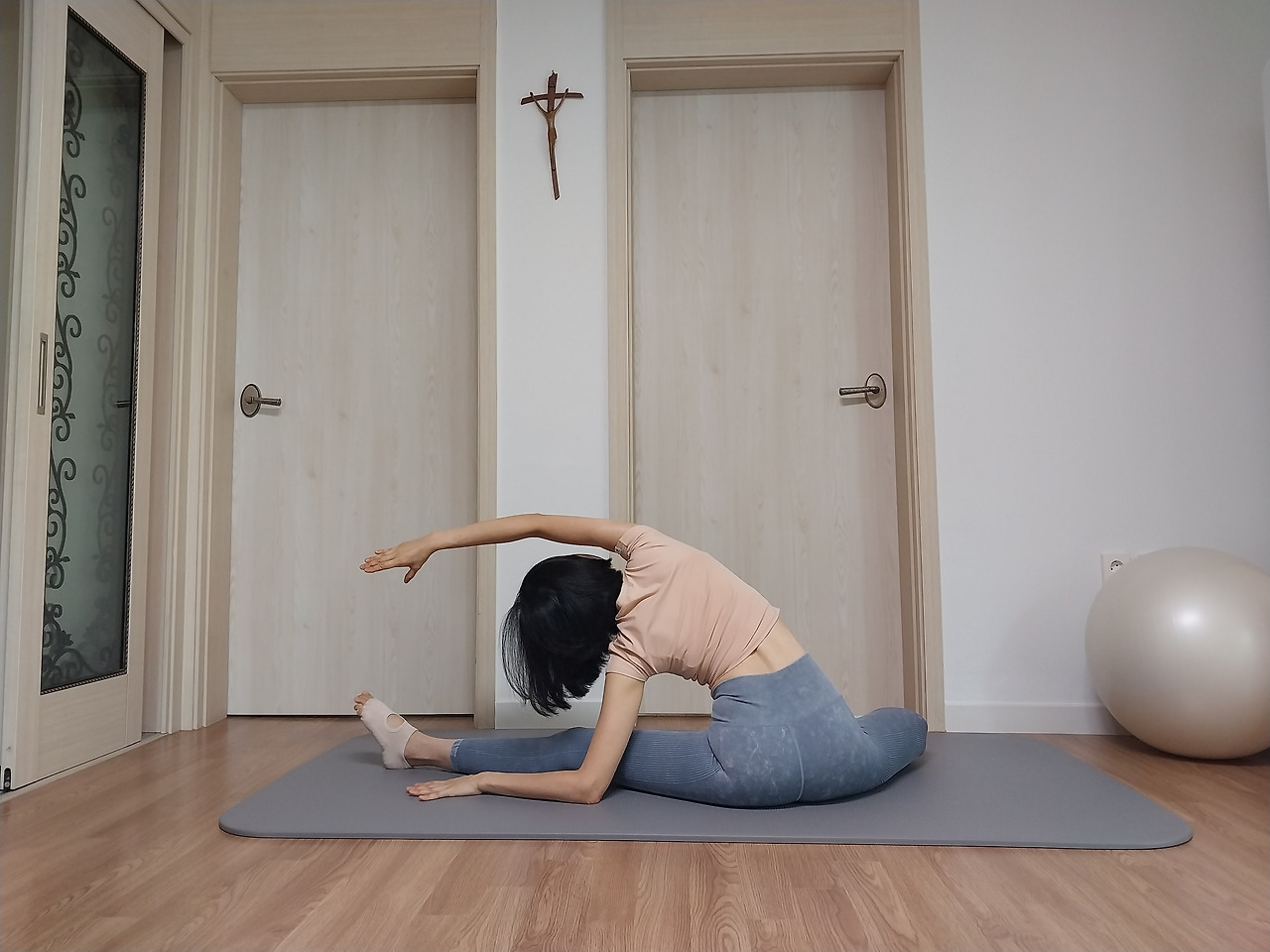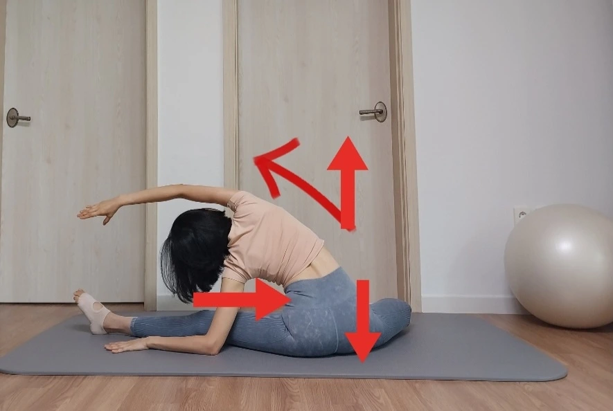 이 상태에서 허리를 펴고 상체를 앞으로 기울일 수 있다면, 양쪽 힙이 바닥에 균일하게 붙어있는 채로 상체를 앞으로 숙여봅니다. 그러면 내려간 골반은 아래쪽이 올라간 골반은 좀 더 위쪽이 늘어나는 느낌이 나게 되어요.