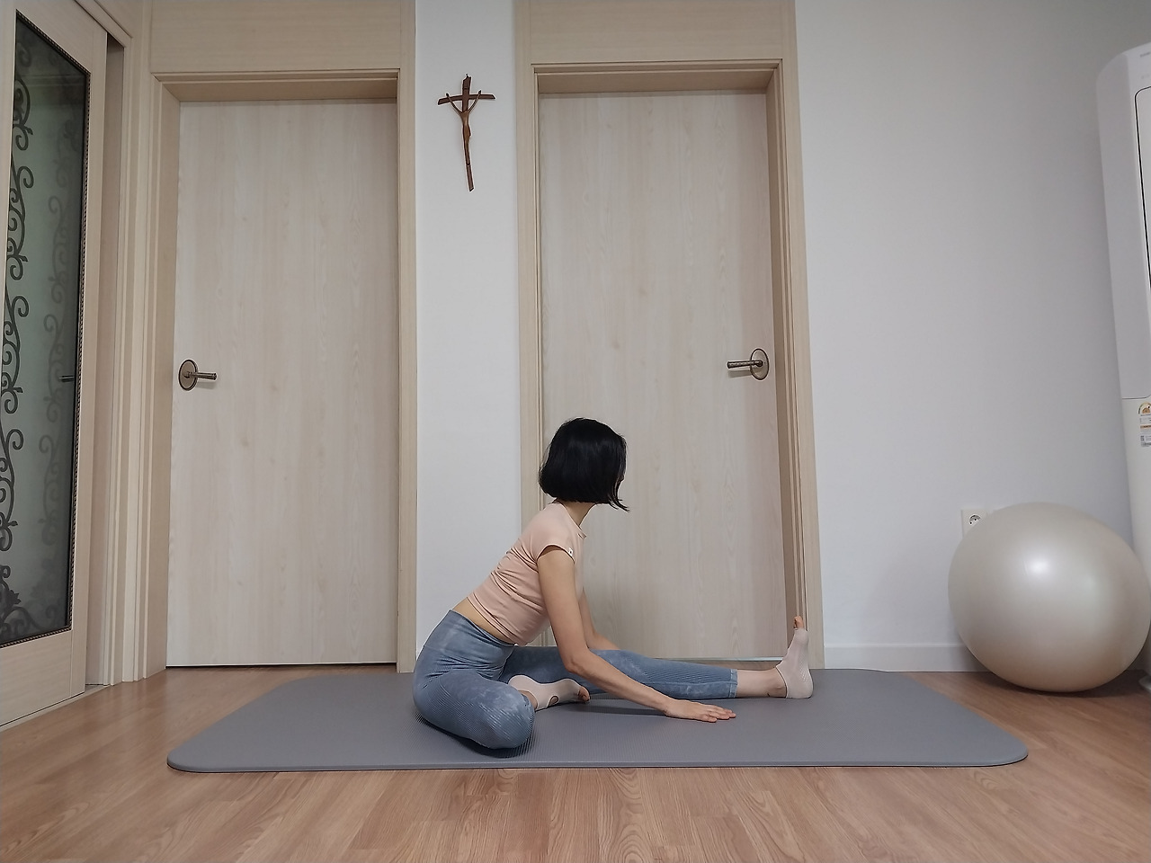 양쪽 힙이 바닥에 똑같이 닿을 수 있도록 앉아서 무릎을 바닥으로 지그시