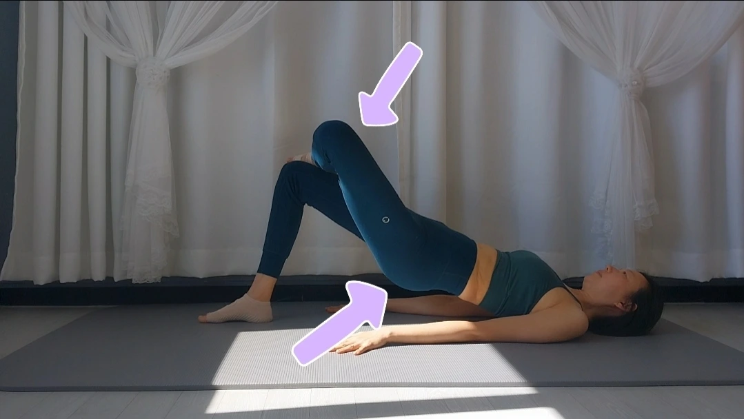 양쪽 전상장골능의 높이가 얼추 맞춰졌다면, 한쪽 다리의 무릎을 접어 반대 다리 위에 얹고 골반교정 브릿지 동작을 해본다.