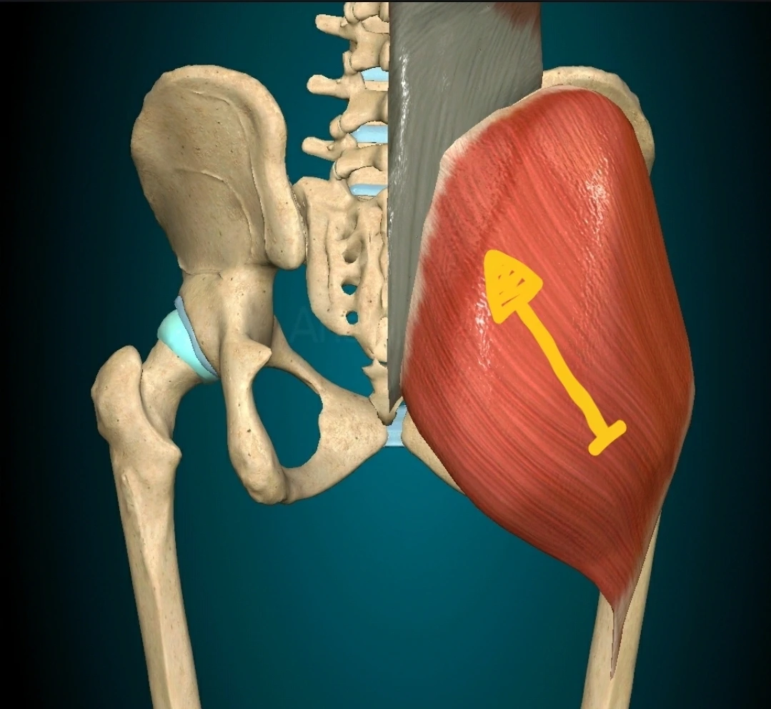 대둔근은 골반 뒤쪽에서 가장 큰 근육이며, 화살표 방향으로 근육의 결을 따라 수축하게 된다.