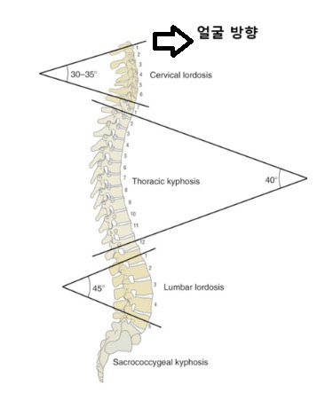 목과 허리는 앞으로 전만 되어 있고, 등과 꼬리뼈는 뒤로 후만 되어 있는 것을 볼 수 있습니다. 당연하다고요? 그런데 이 곡선이 무너진 분들이 정말 많습니다.