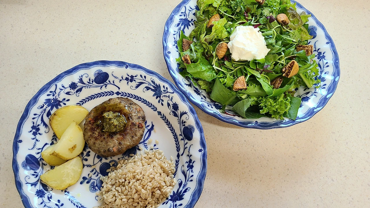햄버거 고기 패티 한 개를 샐러드랑 함께 먹고, 밥만 남았는데 야채가 부족하다.