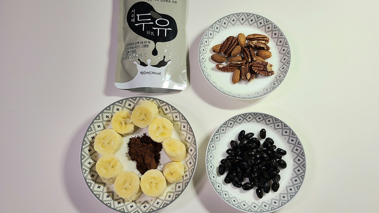 두유, 바나나, 견과류, 삶은 콩 + 마법 분말(바나나 가운데 있어요)