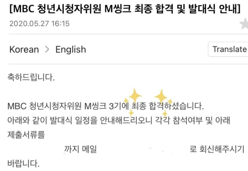 MBC 앞에서 저 파란 인간 모형과 사진 찍어본 적은 있었지만, 방송국 내부는 면접날 처음 들어가 봤다. 이런 기회가 아니고서야 방송국 내부에 들어갈 방법이 잘 없기 때문에 합격을 하든 불합격을 하든 진짜 소중한 경험이라고 생각하며 감격했었다. 면접날이 오기 전에 내가 제출한 지원서와 지원 영상에 대한 예상 질문을 여러 개 만들어 준비하고 갔다. 확실히 준비를 했더니 실전에서 도움이 많이 됐다. 면접을 앞둔 M씽크 4기분들은 찬찬히 자신의 콘텐츠를 살펴보고, MBC 프로그램에 대해서도 생각하면서 너무 부담 갖지 말고 면접에 임했으면 좋겠다. 그렇게 기분 좋게 면접을 보고 나왔더니 얼마 후 합격 메일이 날아왔고 나는 M씽크로서 당당히 발대식에 참석했다. 면접 볼 때는 떨려서 잘 몰랐는데 발대식 때 들어가 보니 무도 촬영지로 자주 나왔던 곳이라 너무 신기했다. 그렇게 함께 합격한 분들과 처음으로 인사도 나누고 프로필 촬영도 하고 위촉장도 받으면서 합격의 기쁨을 마음껏 누렸다. 그리고 다 지나고 보니까 M씽크는 우리에게 수미상관의 감동을 주셨다. 별건 아니지만 이건 마지막에 얘기해야겠다ㅋㅋㅋ