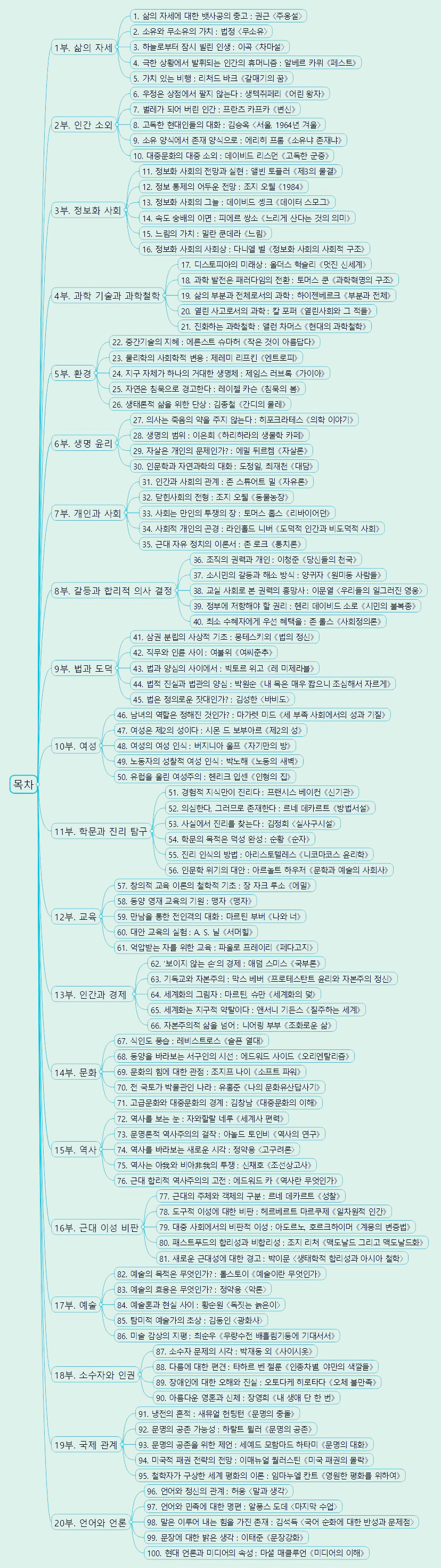 모든 논리적 글쓰기를 아우르는 고전 100종! 20가지 주제를 따라가는 하루 10분 고전 읽기 『논리적 글쓰기를 위한 인문 고전 100』. 오랜 시간 동안 사람들에게 읽힌 고전은 논술의 좋은 양식이다. 이 책은 논술을 처음 시작하는 이들을 위해 기획된 것으로, 다양한 생각을 담은 고전을 20개의 주제별로 분류하여 자신의 생각을 정리할 수 있도록 도와준다. ‘삶의 자세’, ‘인간 소외’, ‘과학 기술과 과학철학’, ‘법과 도덕’, ‘여성’, ‘교육’, ‘소수자와 인권’ 등 총 20개의 주제 당 평균 5종의 고전을 소개한다. 법정의 《무소유》를 비롯하여 이청준의 《당신들의 천국》, 막스 베버의 《프로테스탄트 윤리와 자본주의 정신》 등의 쟁점을 제기하고 전체 줄거리를 요약한다. 아울러 ‘한 구절 경구’와 ‘문답 하나’, 저자를 소개하여 이해를 심화한다.