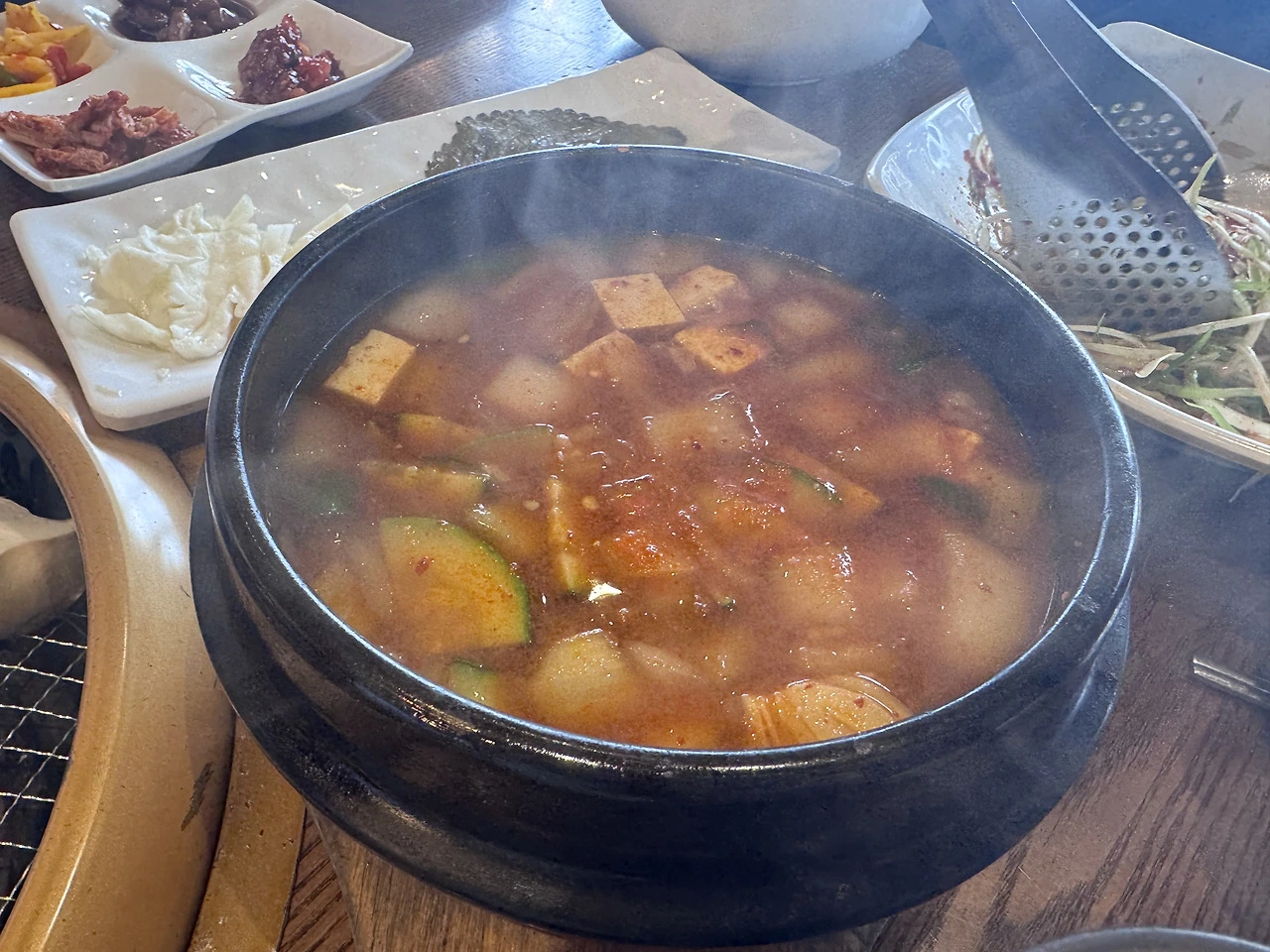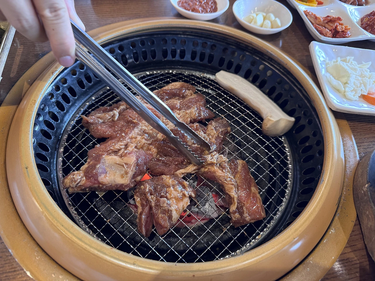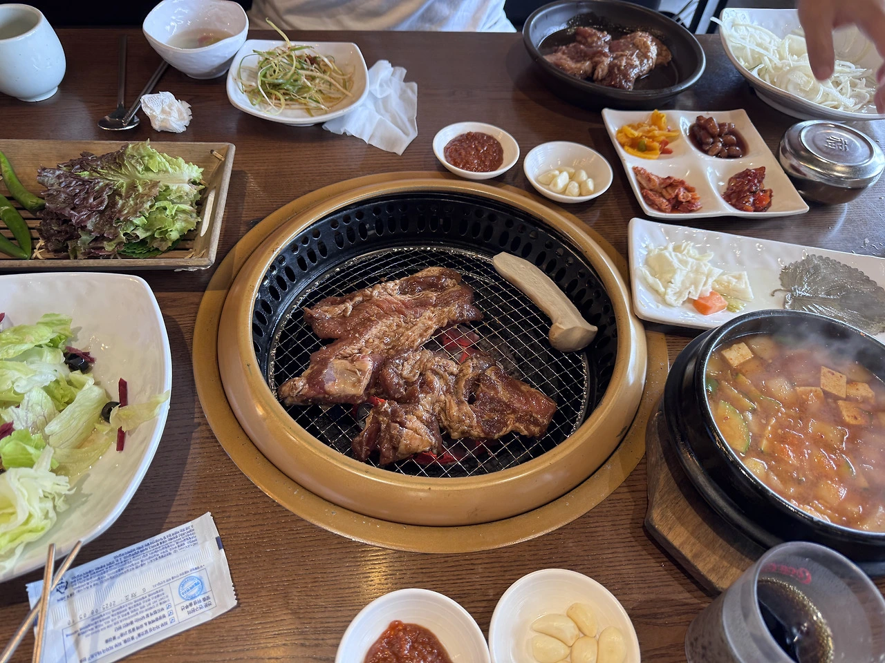 이윽고 테이블 위에는 돼지갈비와 된장찌개가 올랐다.