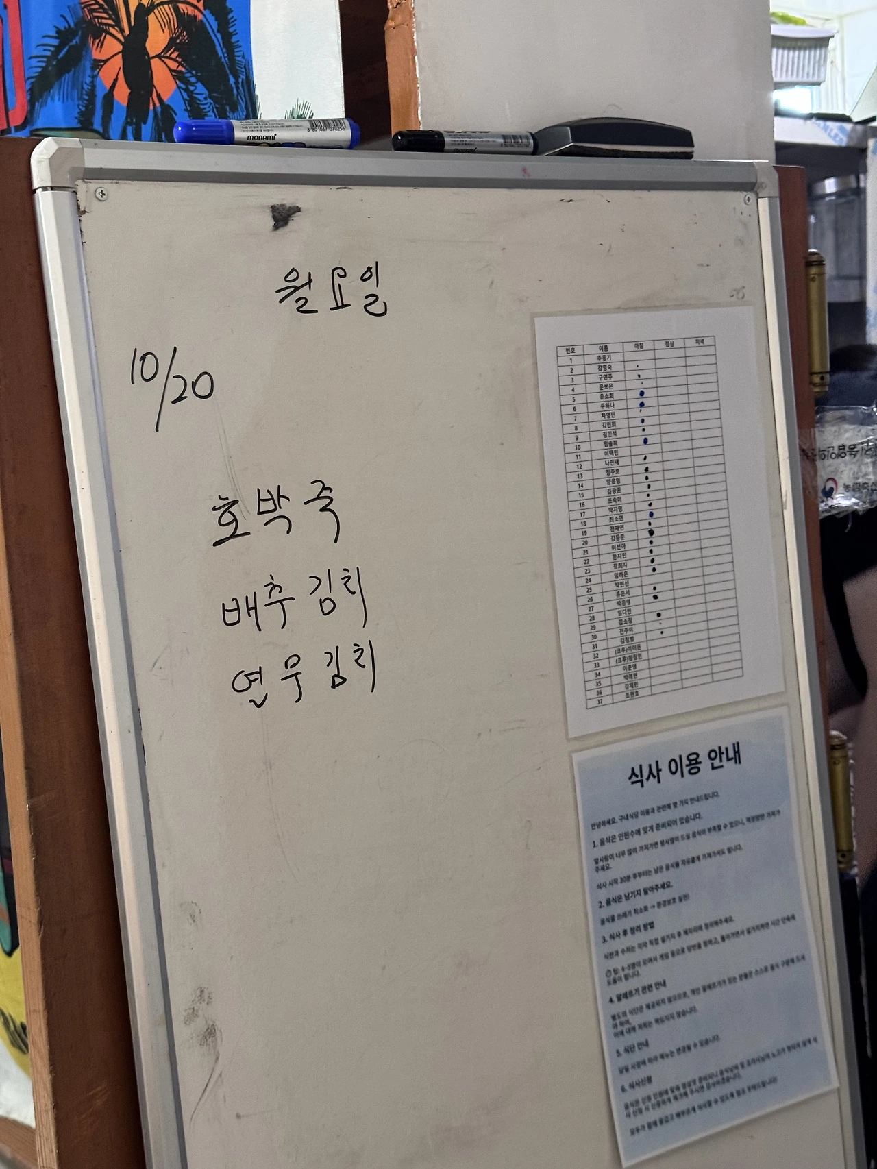 월요일 아침 메뉴는 호박죽과 배추김치, 열무김치였다.