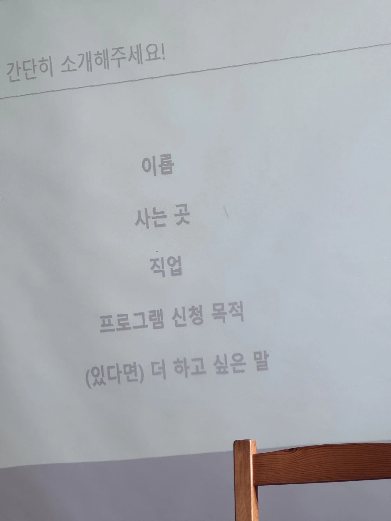 자기소개 포맷은 이름, 사는 곳, 직업, 프로그램 신청 목적 정도.