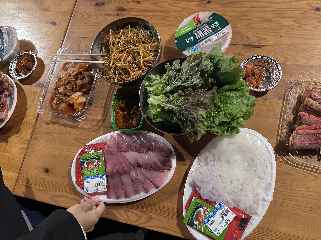 파채를 만들고 쌈 채소를 씻고, 불을 피워 고기를 굽기 시작했다.