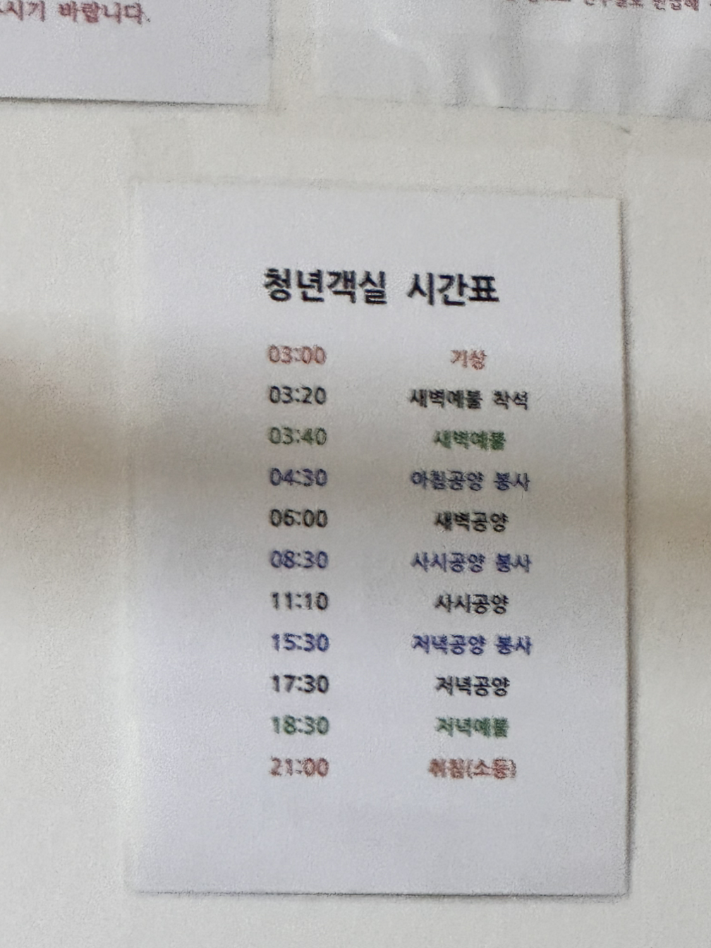 이건 '청년객실 대방'에 붙어있던 시간표.