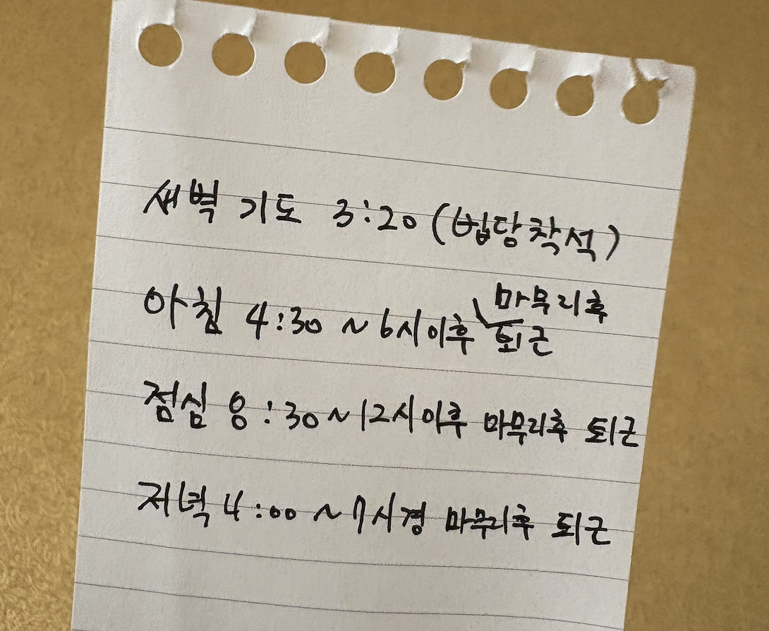새벽에 예불을 드리기 위해 3시 20분에 법당에 착석해야 합니다.