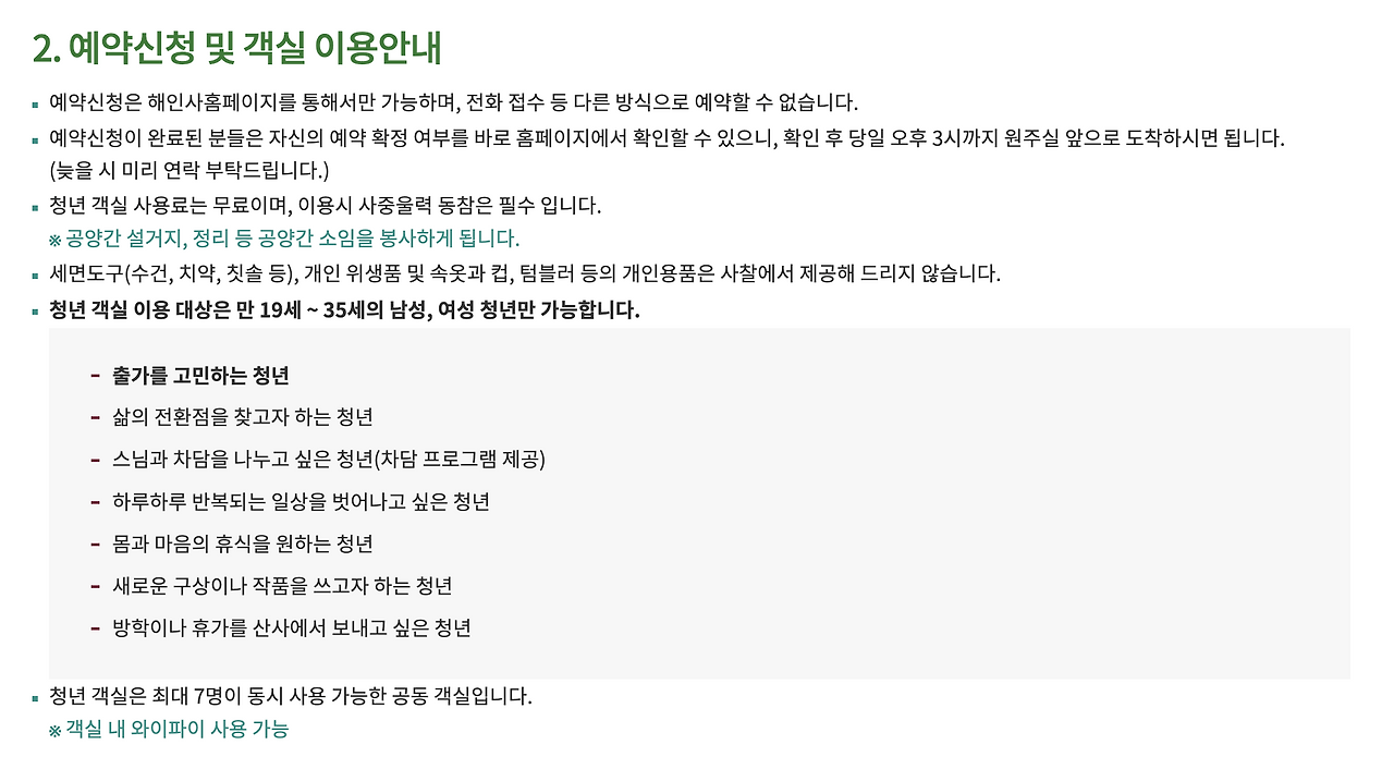 '청년객실 사용료는 무료이며, 이용시 사중울력 동참은 필수입니다'