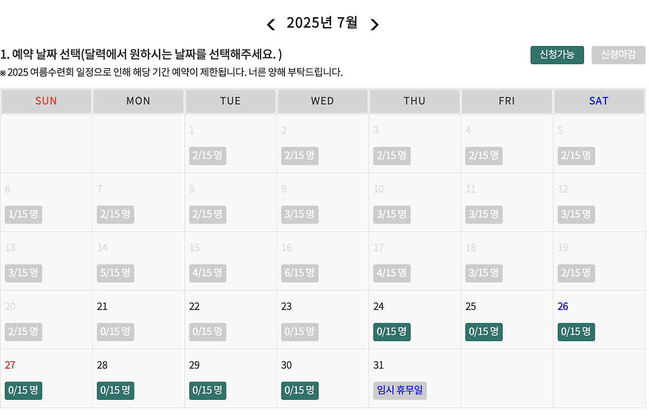 이런 시간표로 진행되는 청년객실은 예약 페이지에서 원하는 일자에 예약을 하면 됩니다.