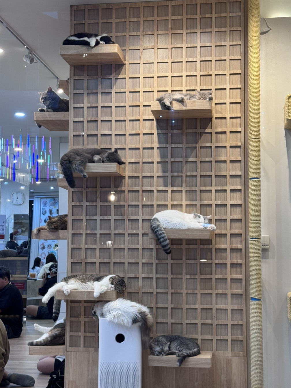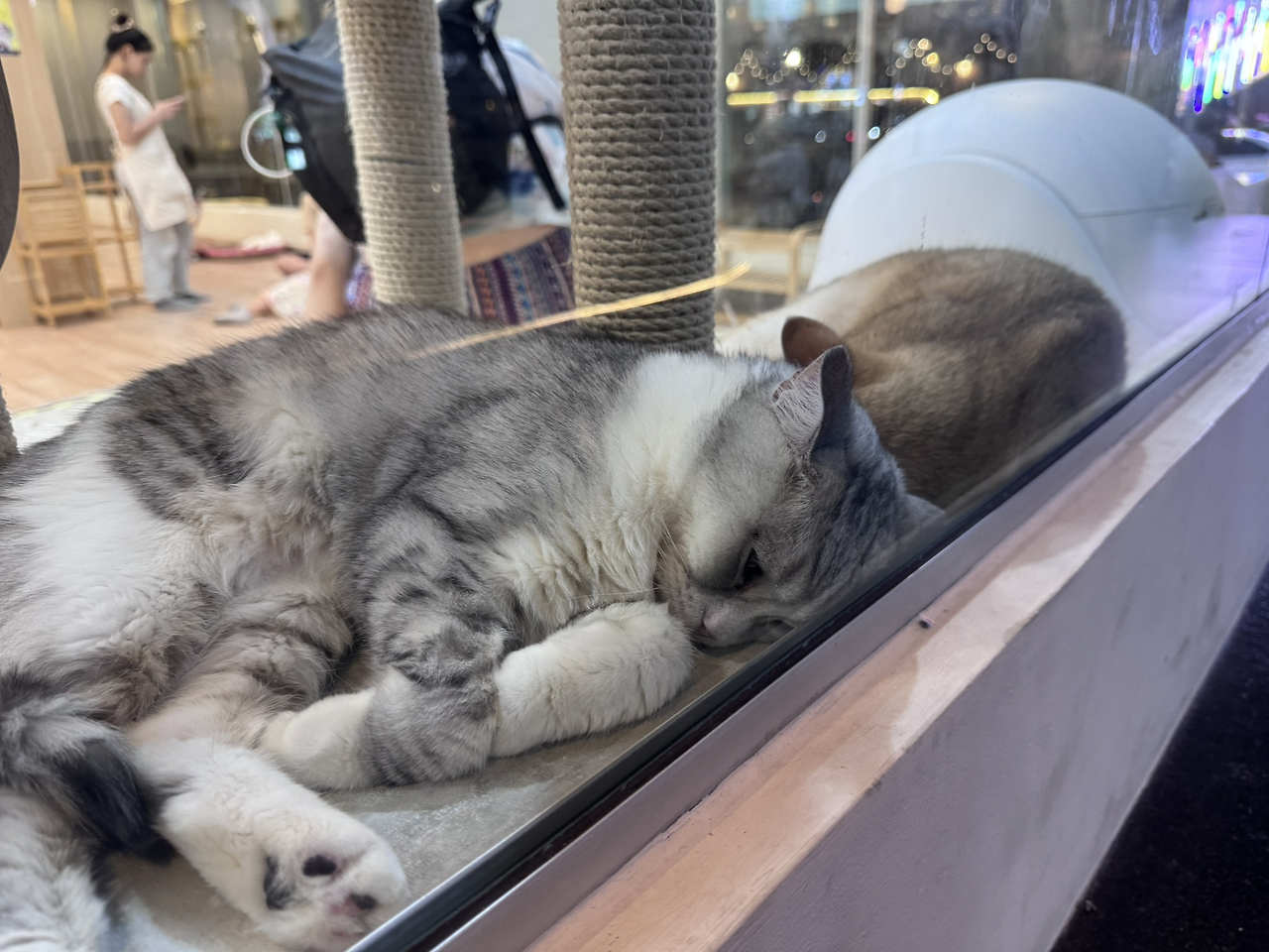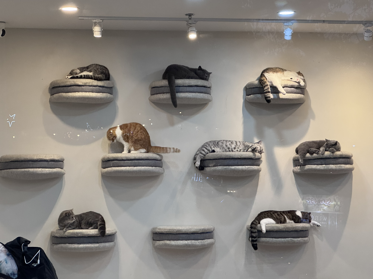 많은 고양이들은 사람의 손이 닿지 않는 벽면의 캣타워에 올라가서 잠을 청하고 있었다.